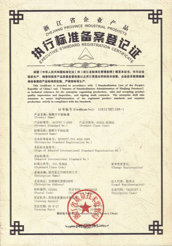 企業(yè)產(chǎn)品執(zhí)行標(biāo)準(zhǔn)備案登記證