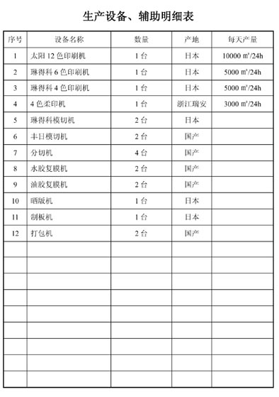 生產(chǎn)設(shè)備及輔助設(shè)備一覽表